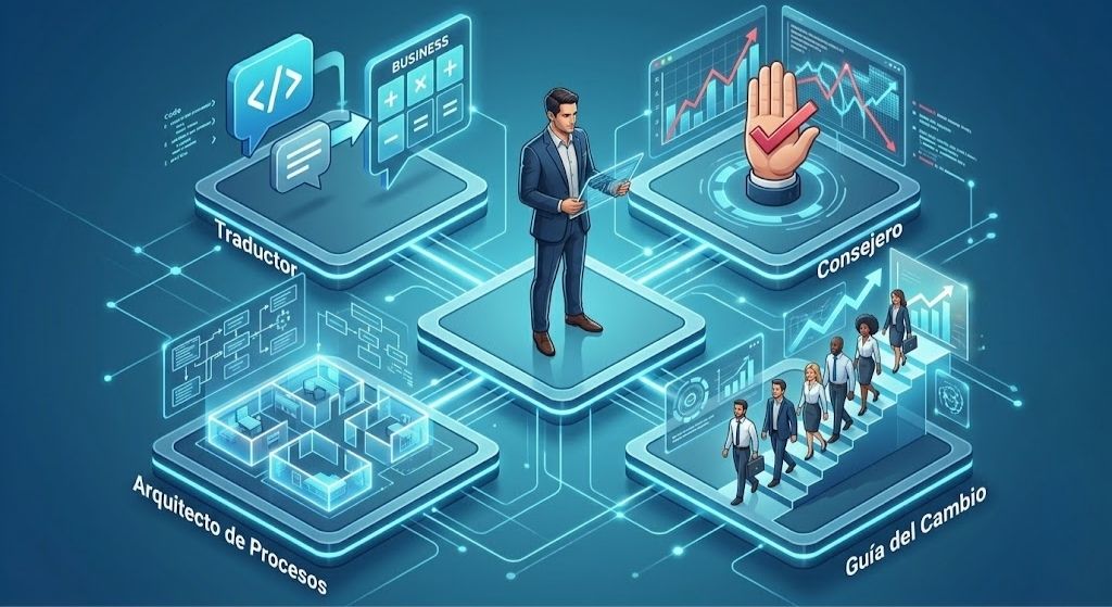 El mayor problema en las empresas es que la tecnología y la toma de decisones hablan idiomas distintos. El consultor es el traductor bilingüe. Entiende los dolores de negocio del CEO y sabe traducirlos a requerimientos técnicos exactos para que los desarrolladores construyan la solución perfecta.